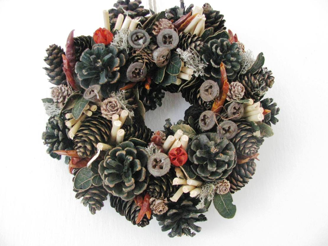materiál: sušené ozdoby, šišky, dřívka...