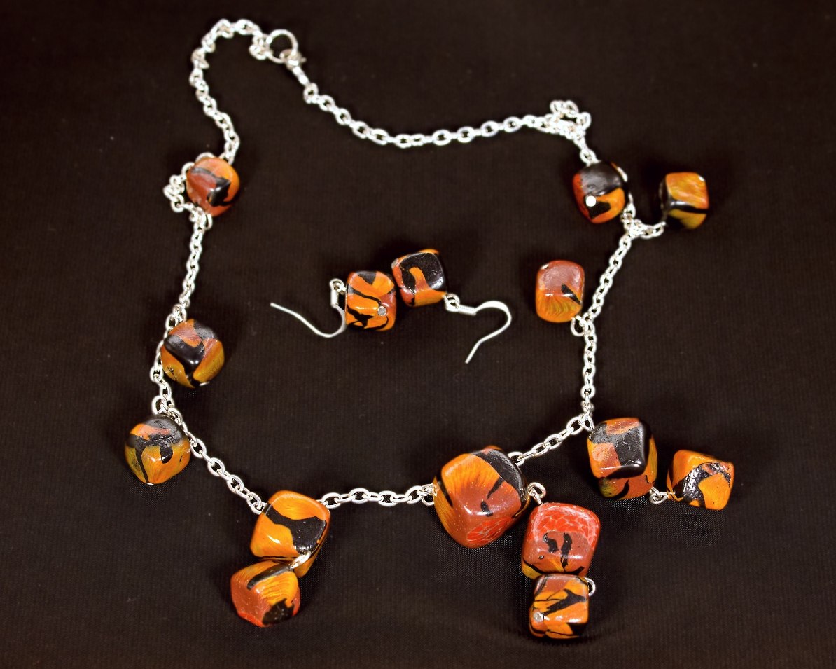 – nepravidelně vzorované kostky v různých tónech hnědé s černou, ketlované na stříbrném řetízku + náušnice