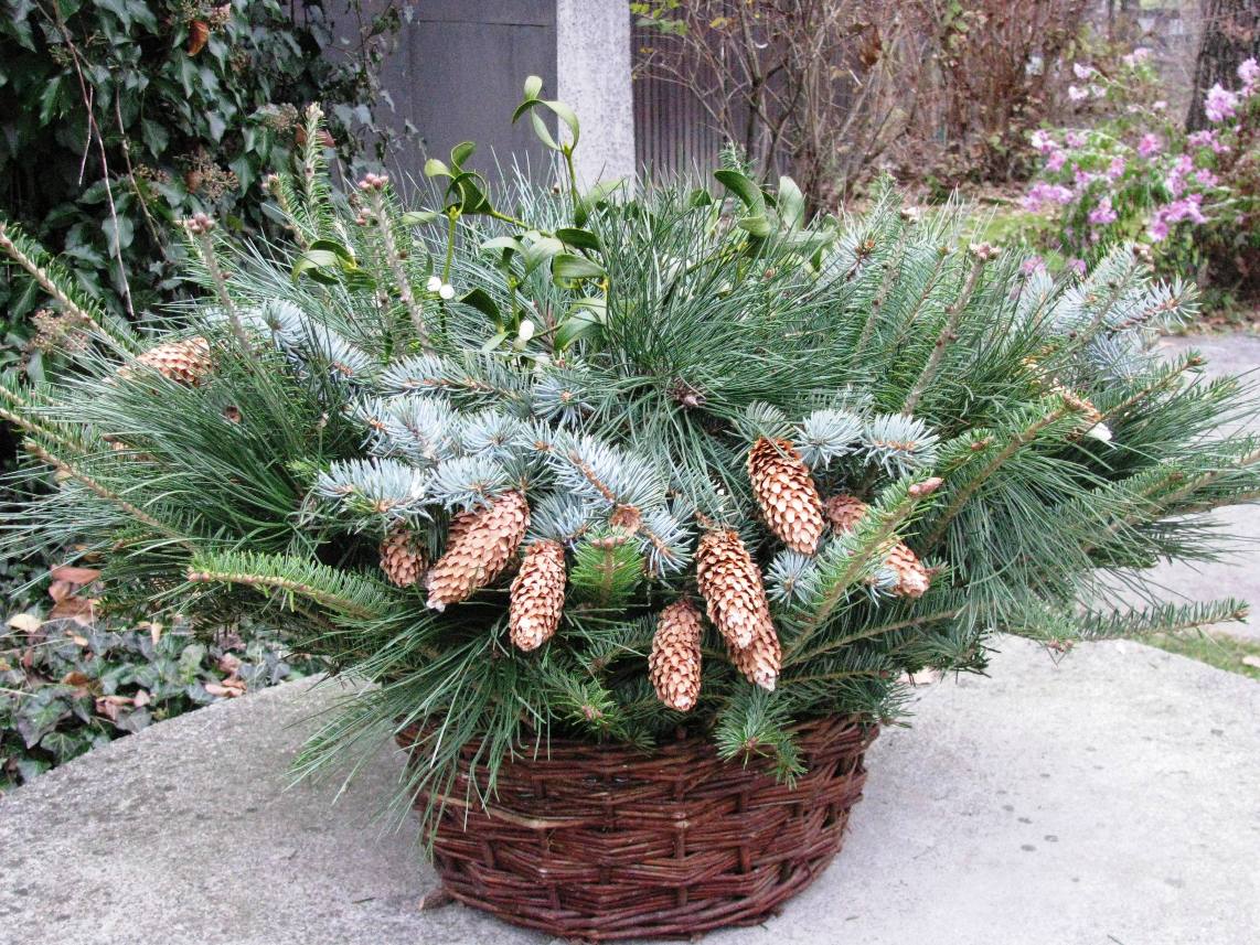 materiál: proutěný koš, větve různých jehličnanů, šišky, jmelí