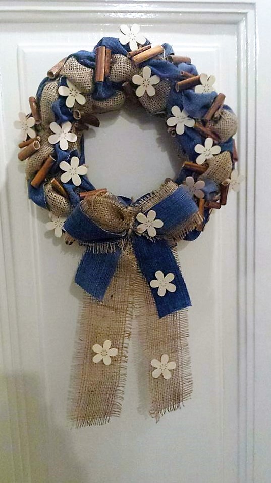 Věnec z pytloviny dekorován riflovinou, bílými květy a dřvenými kolíky