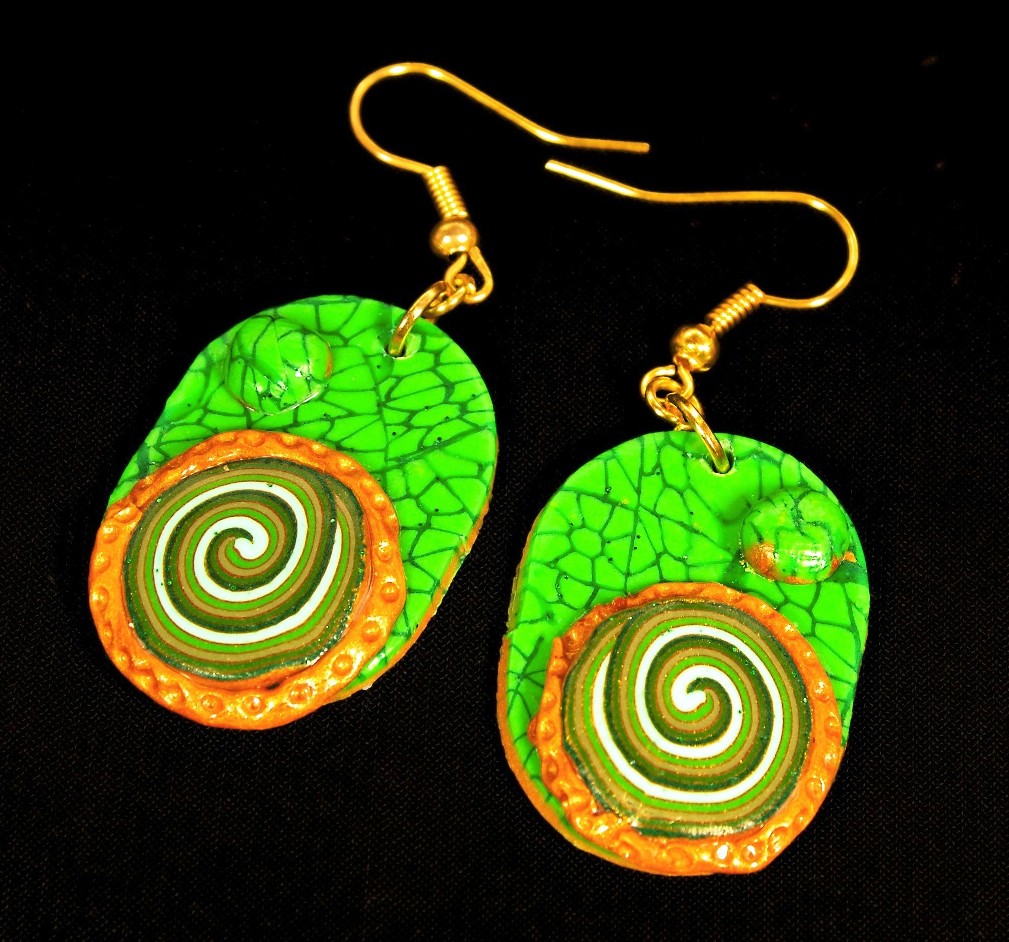 – na jasně zeleném podkladu s geometrickým vzorem zelenozlatá spirála na afroháčku zlaté barvy. Lze vytvořit soupravu s přívěskem: zelenozlatý ovál